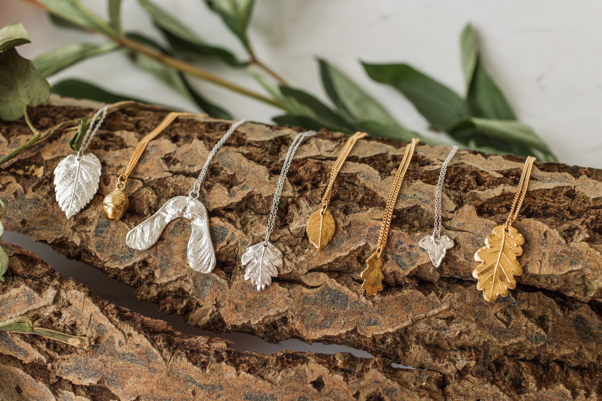 From sculpted leaf pendants to seed-inspired earrings, these pieces reflect the quiet power of the woodland.