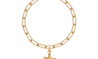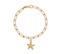 Model wearing Iris & Lolli Gold Starfish Necklace with matching Gold Starfish Charm Bracelet and Gold Cockle Shell Earrings handcrafted from recycled silver with 18ct gold vermeil finish