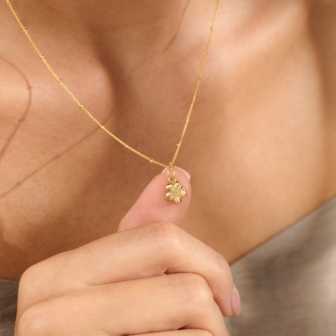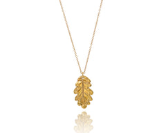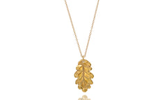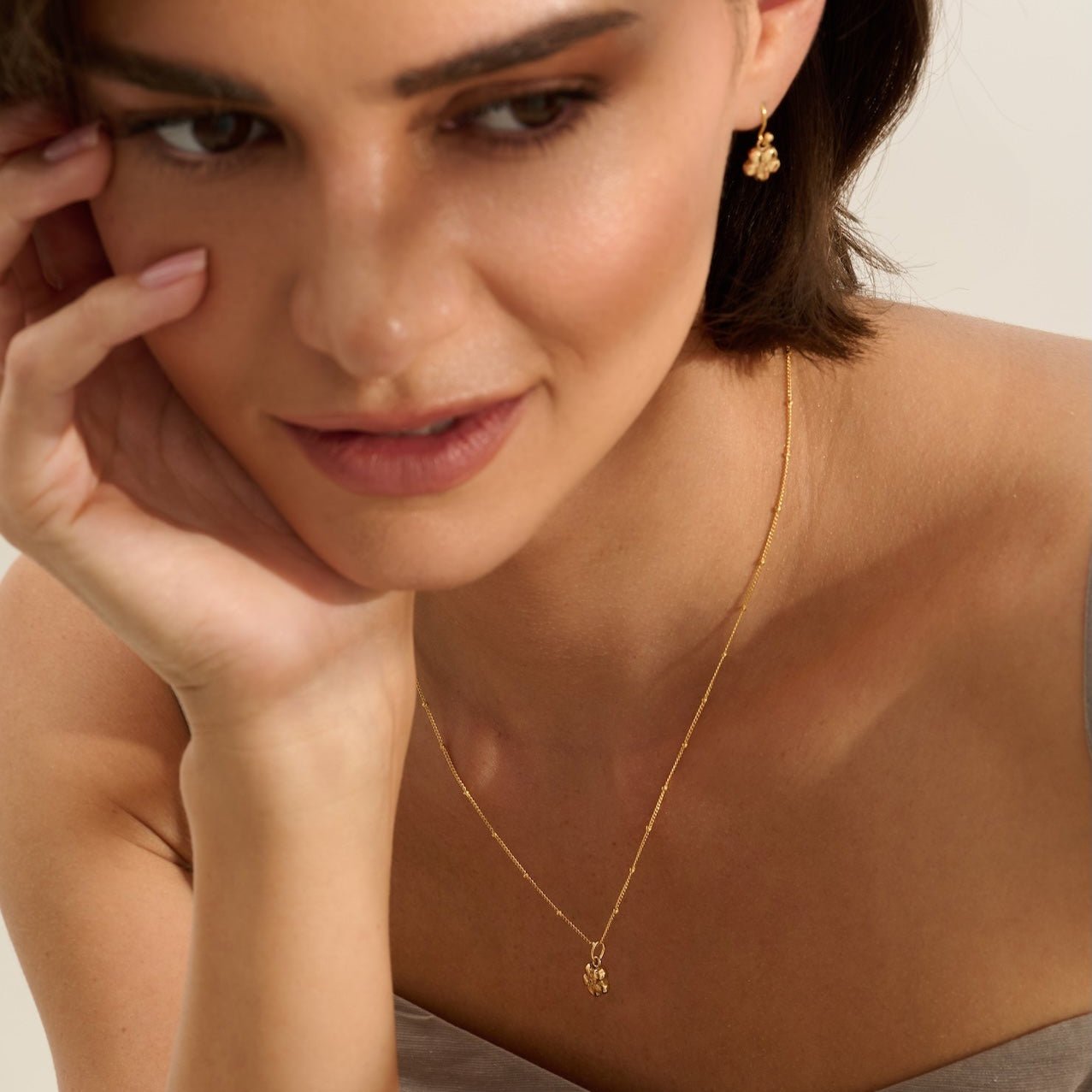 model wearing 18ct gold vermeil four-leaf clover bracelet and gold baby oak leaf pendant necklace by Iris & Lolli