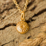 This Gold Corn Poppy Crown Necklace is handcrafted from recycled silver and coated in 18ct gold, cast from a real poppy seed head to capture every natural ridge and fold. Its petite circular pendant glows softly against the skin, an echo of golden meadows and sunlit calm.