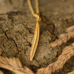 This Gold Rosemary Leaf Necklace is handcrafted from recycled silver and coated in 18ct gold, cast from a real rosemary leaf to preserve its slender form and fine, linear texture. Its golden surface catches the light with quiet warmth, a simple, organic shape that feels both elegant and meaningful.