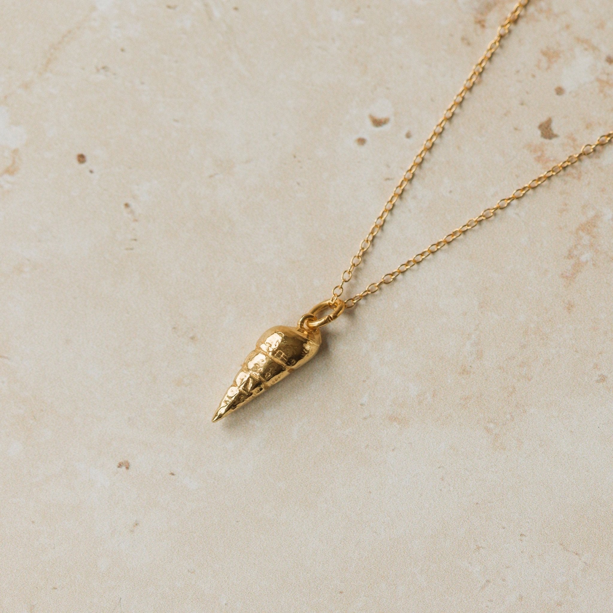 The Auger Necklace is the perfect summer addition to your jewellery collection, sculpted by hand from a real Auger Shell in recycled silver & then coated in a luxurious layer of 18K gold.