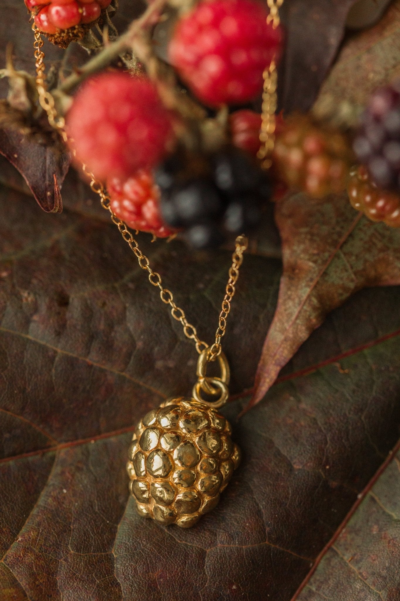 This deliciously plump shiny berry pendant is made by hand from a real blackberry in solid silver before being coated in a luxurious layer of 18ct gold.
