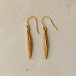 Handmade recycled gold rosemary dainty leaf drop earrings by Iris and Lolli on white background, nature inspired and crafted in the UK