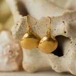Handmade recycled gold Venus clam shell drop earrings by Iris and Lolli on white background, ocean inspired and crafted in the UK