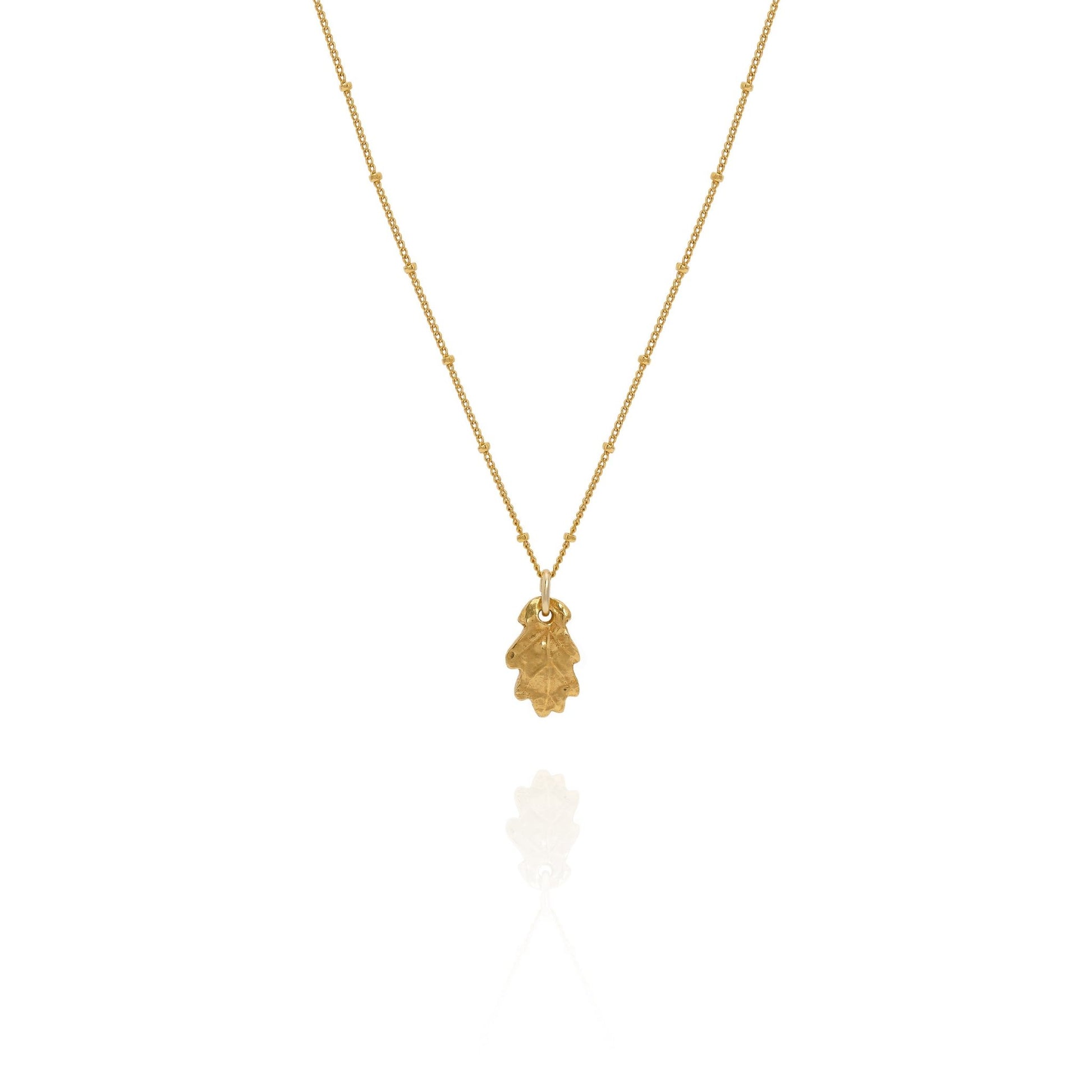 The Baby Oak Leaf Necklace is the ultimate addition to your jewellery collection, sculpted by hand from a real oak sapling leaf in recycled silver & then coated in a luxurious layer of 18K gold.