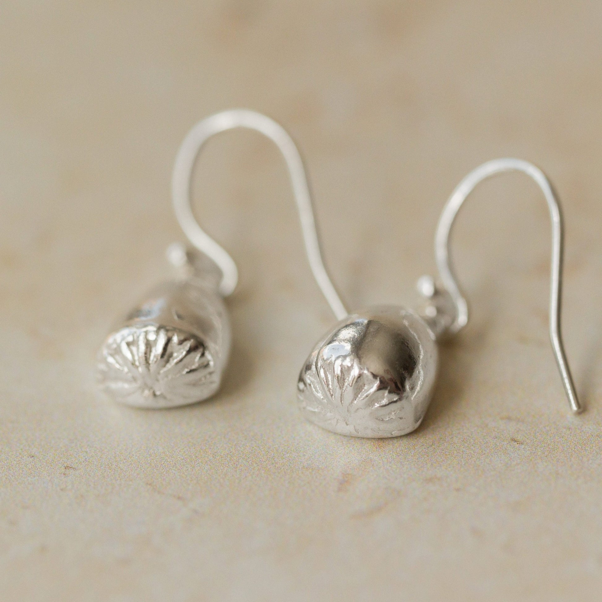 These Silver Red Corn Poppy Seed Head Earrings are handcrafted from recycled silver, cast from real red corn poppy seed heads to capture their soft, rounded form and organic texture. Their gentle shine and sculptural silhouette make them a timeless nod to nature’s enduring grace.