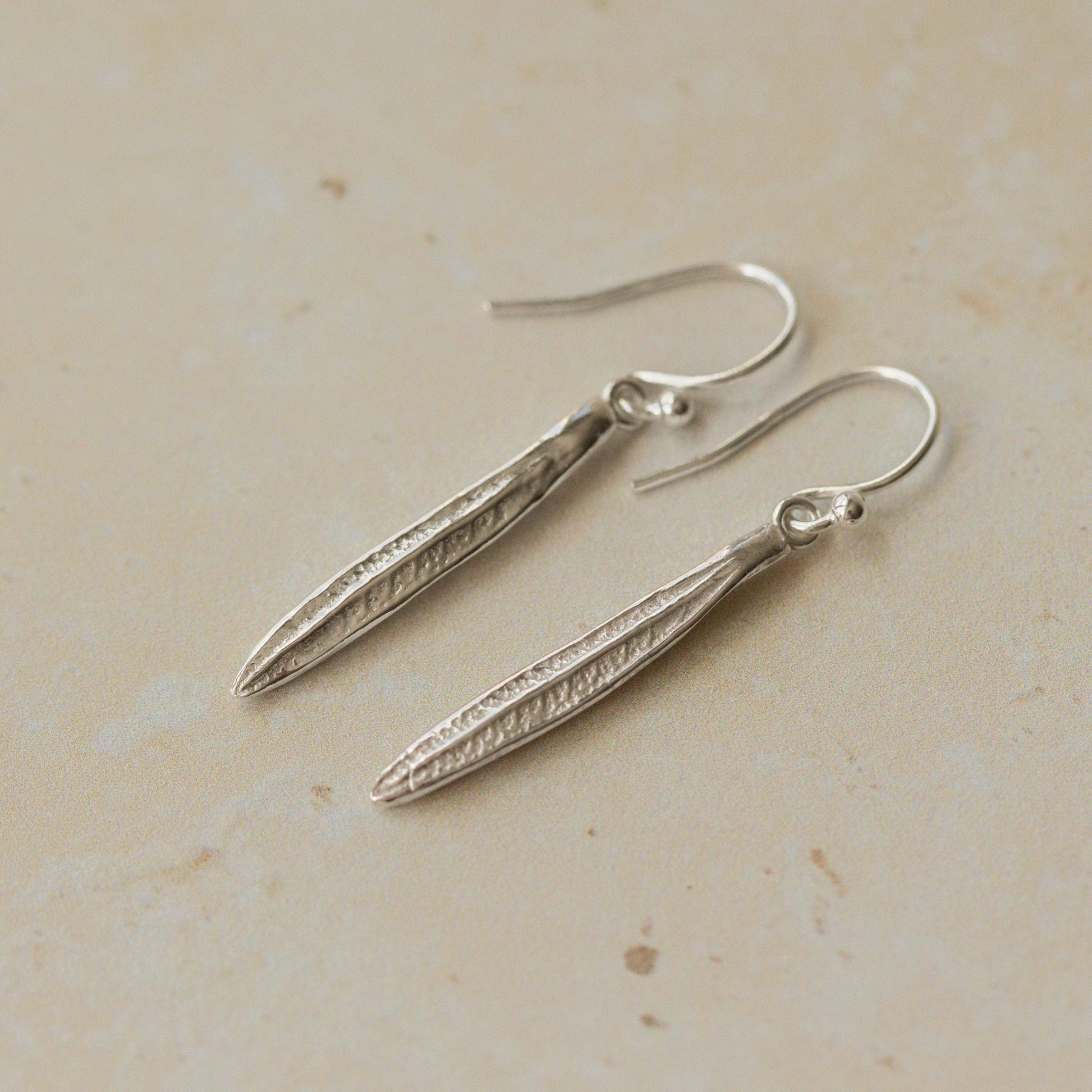 These Silver Rosemary Leaf Earrings are handcrafted from recycled silver, cast from a real rosemary leaf to preserve every fine line and organic curve. Their slim, tapered form moves gently with the wearer, reflecting light in soft, silvery glimmers that feel both grounding and serene.