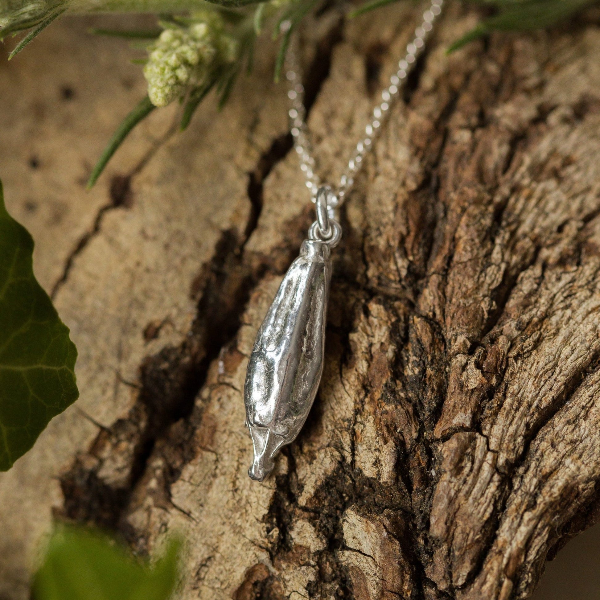 This Silver Welsh Poppy Necklace is handcrafted from recycled silver, cast from a real Welsh poppy seed head to preserve its slender shape and fine natural details. Its smooth, organic form catches the light gently, understated, symbolic, and full of strength.